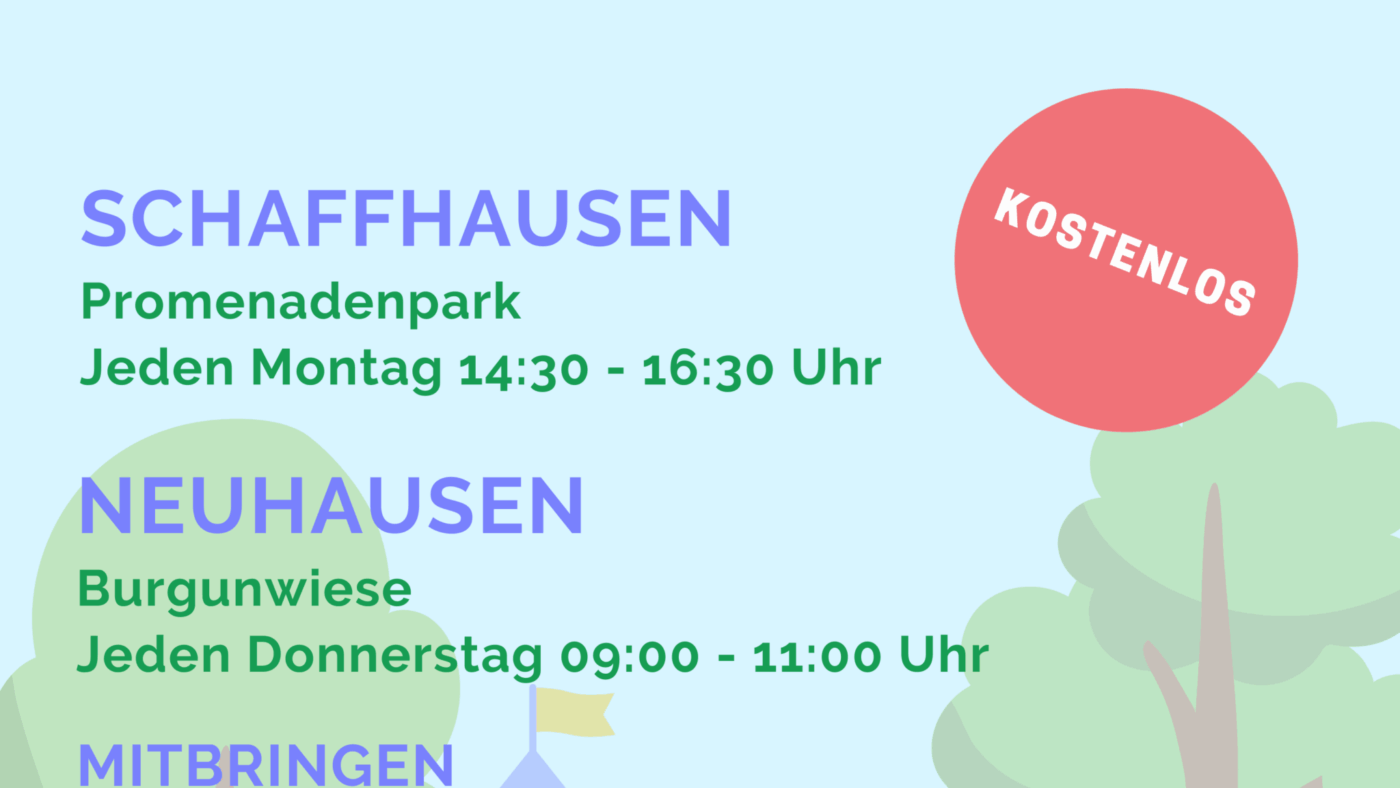 - Schaffhausen: Promenadenpark, jeden Montag 14:30 – 16:30 Uhr (ausser Pfingstmontag, 6. Juni 2025)