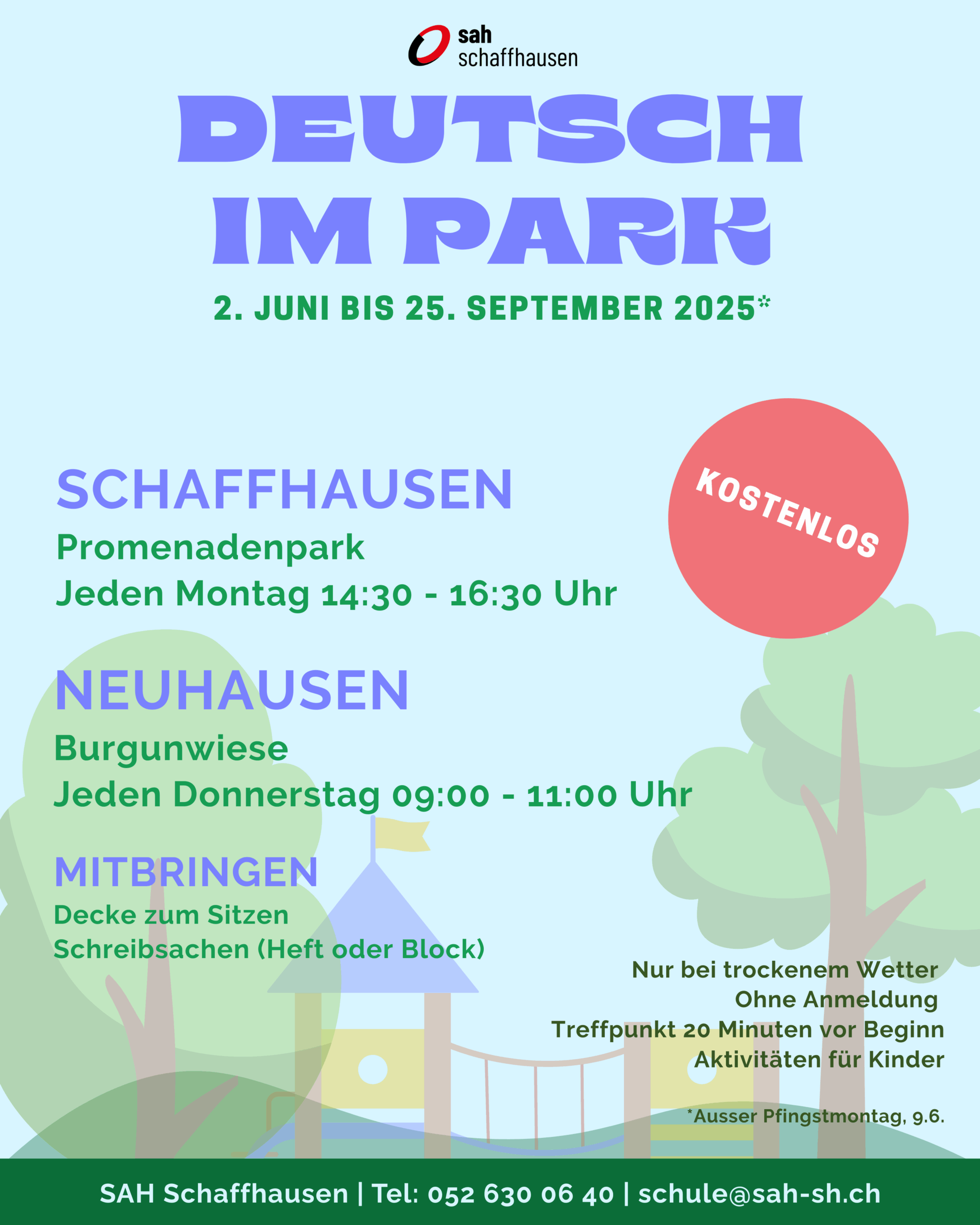 Vom 2. Juni bis 25. September bieten wir Deutsch im Park an. Es ist kostenlos und frei zugänglich für alle Personen, die gerne in lockerer Atmosphäre ihre Deutschkenntnisse erweitern möchten – unabhängig vom Deutschniveau. Kinder dürfen gern mitgebracht werden.