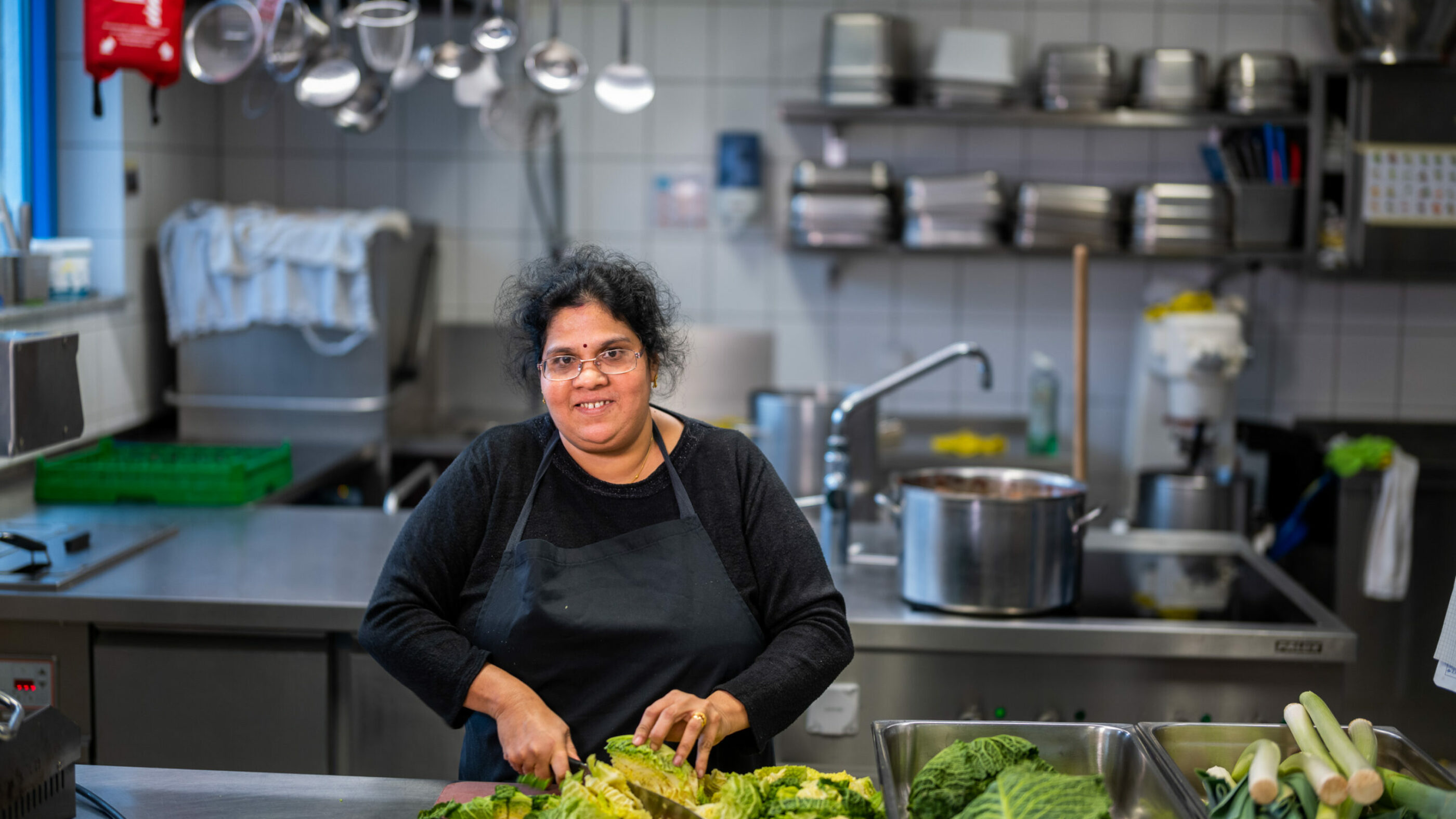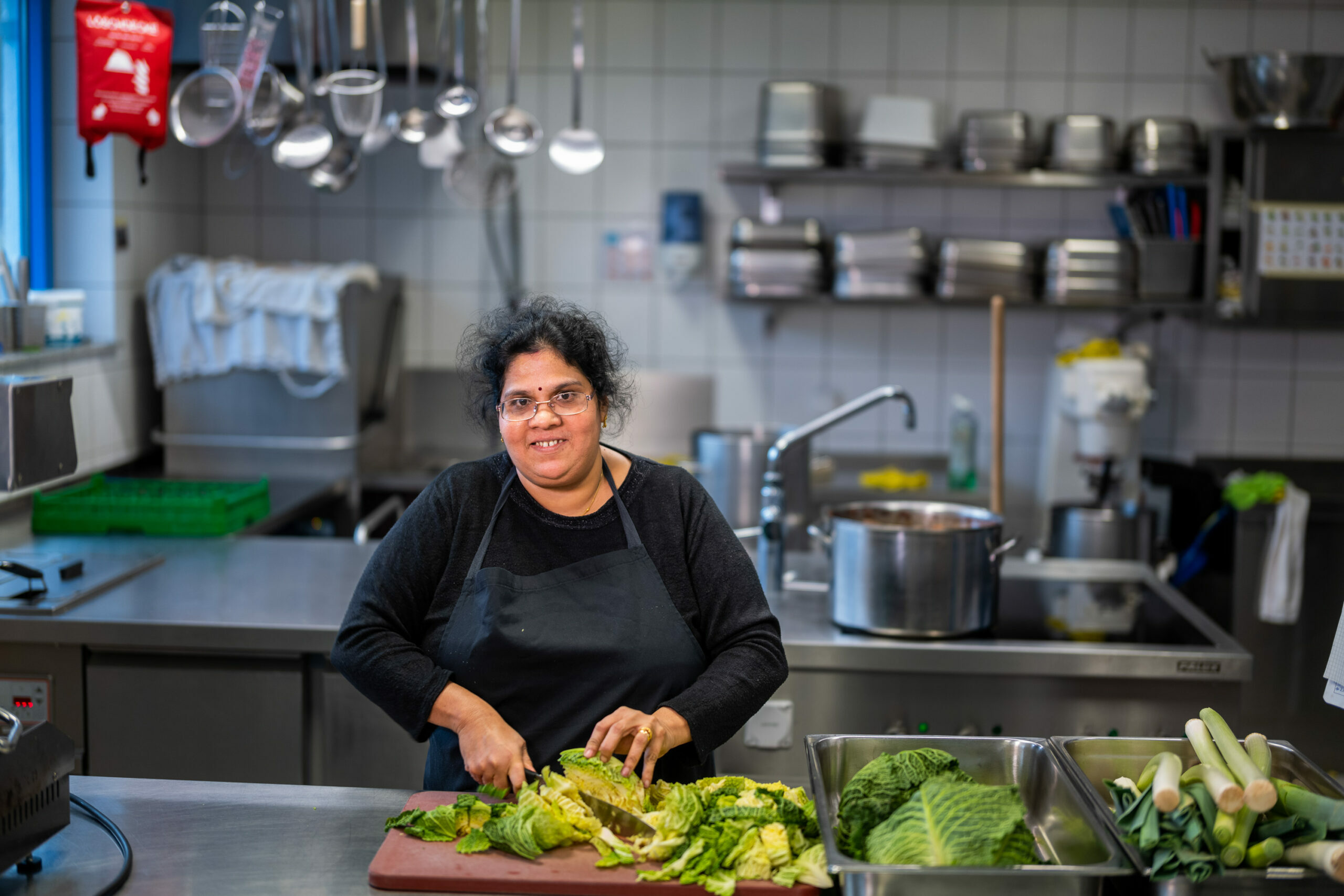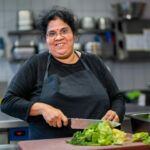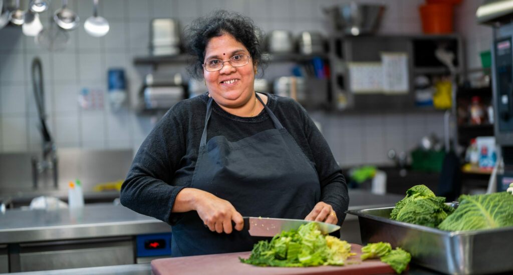 Vini und ihre Kinder kommen vor acht Jahren aus Sri Lanka in die Schweiz, ihr Mann ist schon fünf Jahre länger hier. Sie ist froh, dass die ganze Familie wieder zusammen ist. Ihr Sohn ist in der Ausbildung zum Fachmann Gesundheit, ihre Zwillingstöchter besuchen die zweite Oberstufe. Sie hat fünf Jahre lang beim SAH Deutsch gelernt und noch während dieser Zeit, vor drei Jahren, angefangen, beim kulinarischen Integrationsprojekt «essKultur» zu arbeiten. Kochen ist ihre Leidenschaft und letztes Jahr hat sie sich dazu entschieden, das zu ihrem Beruf zu machen. Die Lehre als Küchenangestellte gefällt ihr gut: «In der Schule sind vor allem Deutsch und Mathematik etwas schwierig, aber ich möchte immer noch mehr lernen. Berufskunde mag ich am liebsten.» Mit 42 Jahren gehört sie zu den Ältesten der Klasse, aber es hat noch einen 53-jährigen Mann aus Sri Lanka, der auch die Ausbildung macht. Vini ist es wichtig, dass sie ein Diplom hat, daher möchte sie die Lehre unbedingt gut abschliessen. Ob sie danach die EFZ-Ausbildung macht, weiss sie noch nicht – «Ich habe noch Zeit, mich zu entscheiden.»